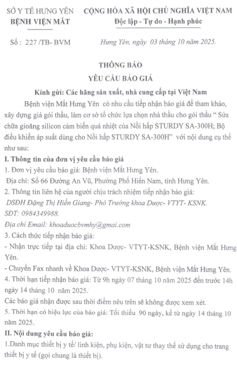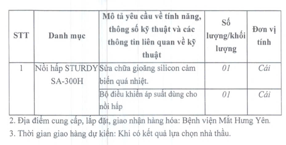 Yêu cầu báo giá gói thầu: Sửa chữa gioăng silicon cảm biến quá nhiệt của Nồi hấp STURDY SA-300H; Bộ điều khiển áp suất dùng cho Nồi hấp STURDY SA-300