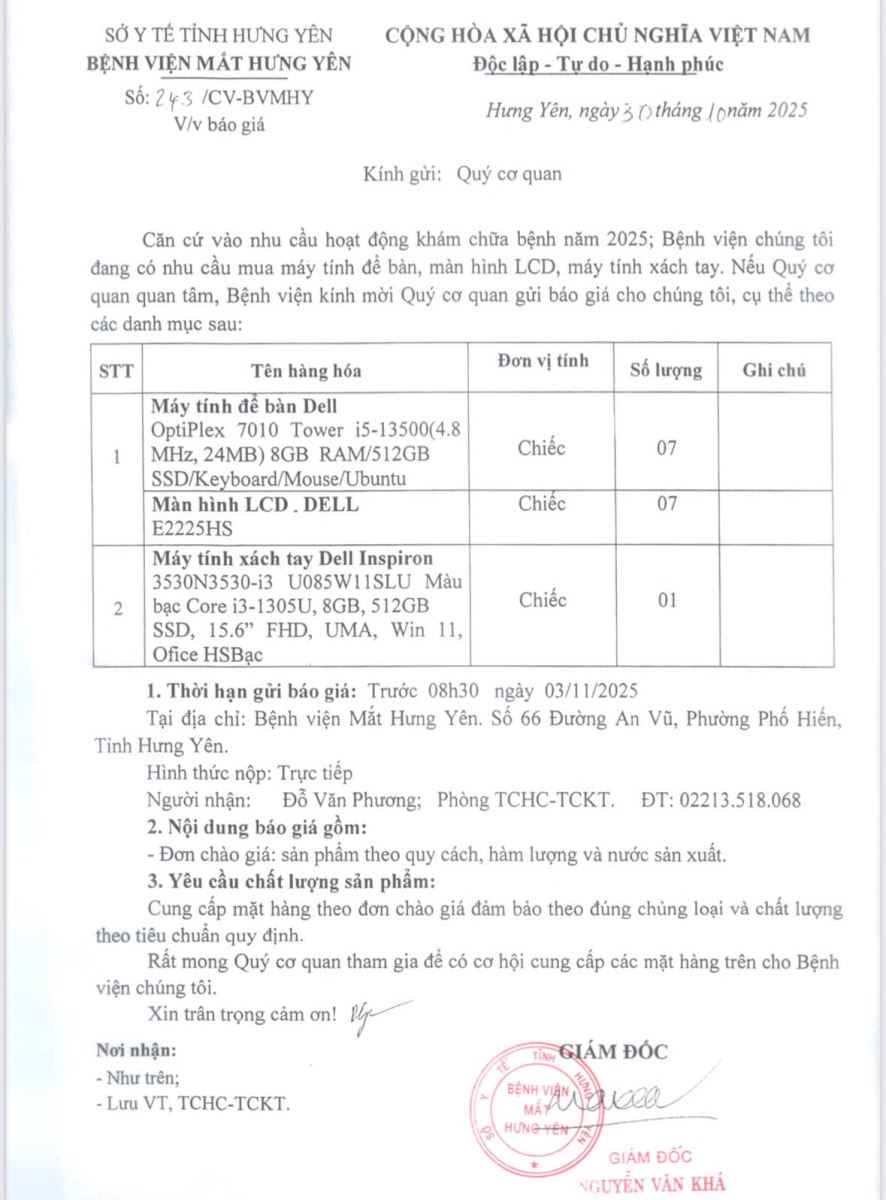 Báo giá máy tính để bàn, màn hình LCD, máy tính xách tay bệnh viện Mắt