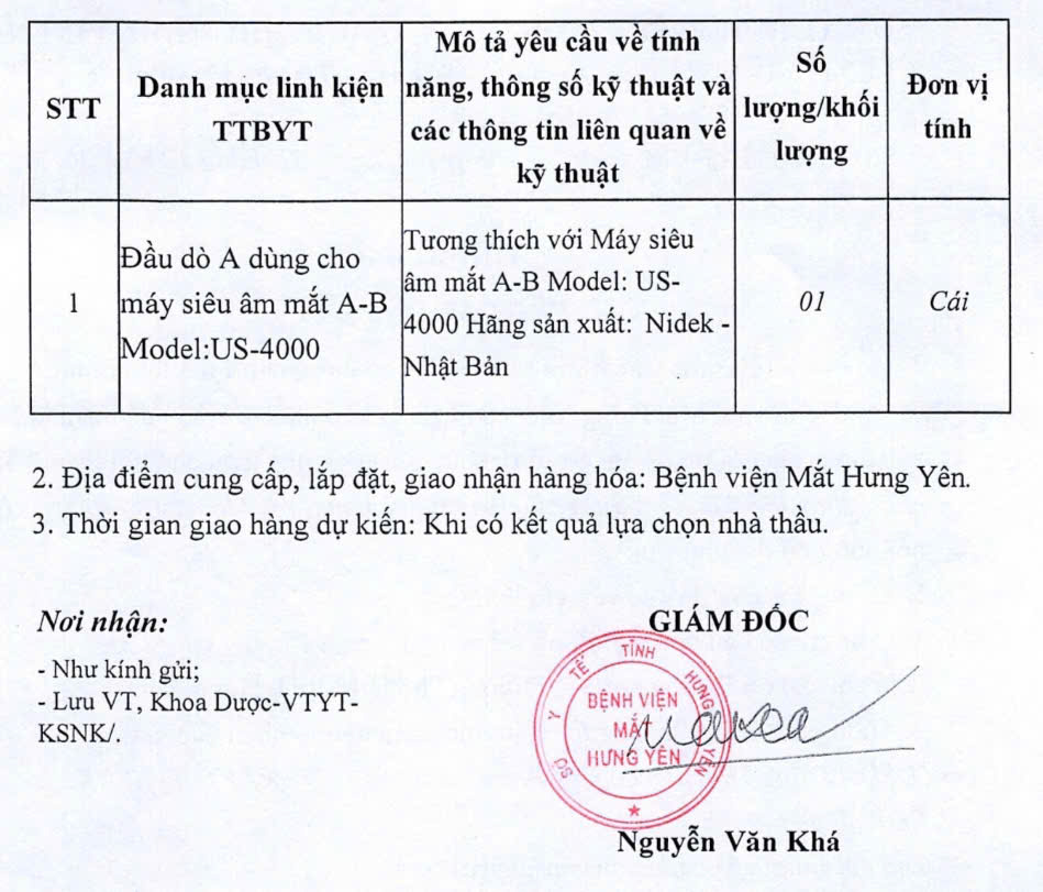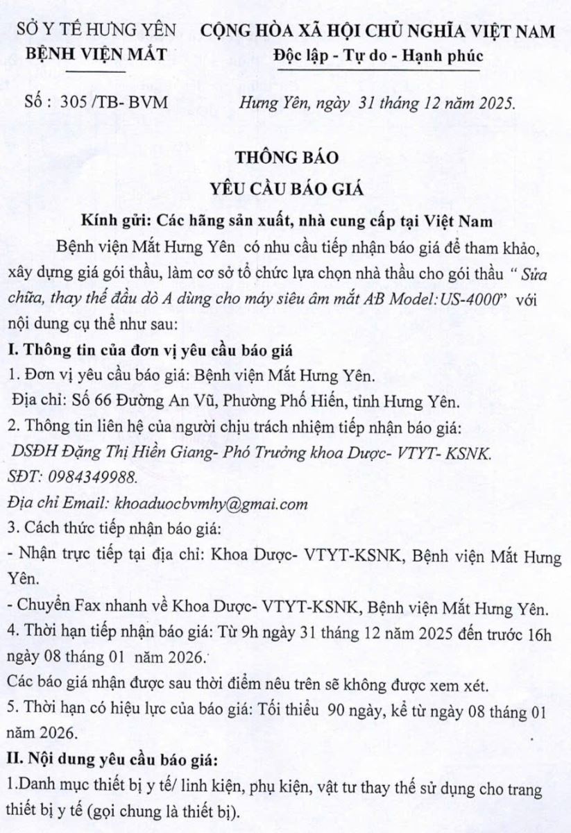 Thông báo yêu cầu báo giá gói thầu sửa chữa, thay thế đầu dò A dùng cho máy siêu âm mắt A-B Model: US-4000 Bệnh viện Mắt
